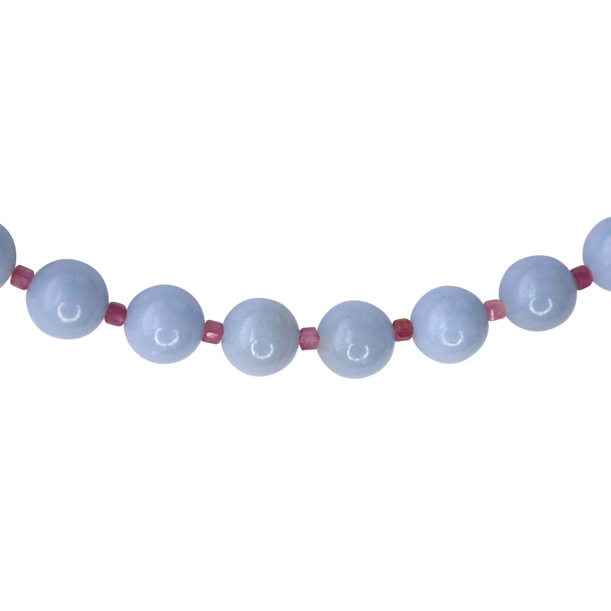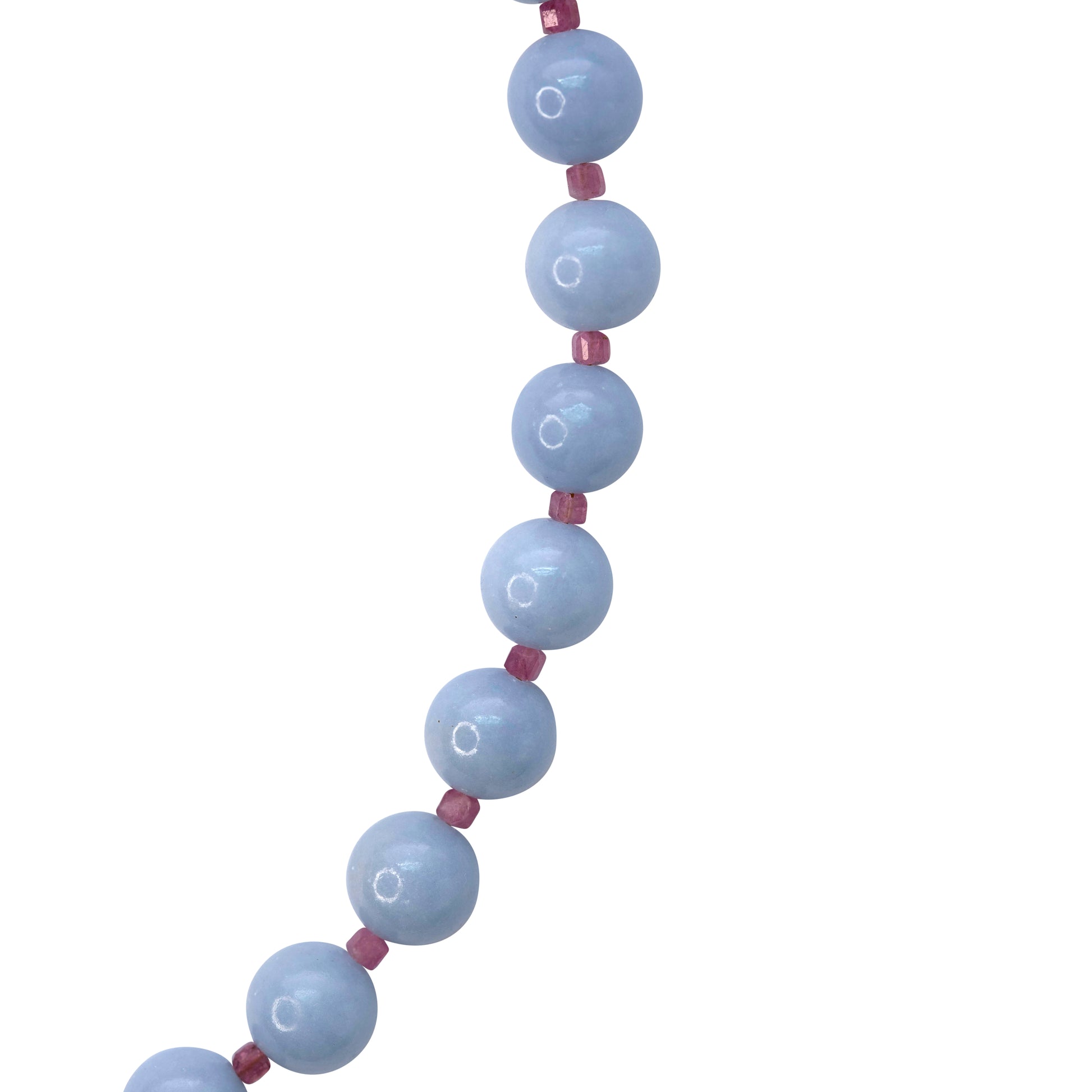 This elegant angelite and tourmaline necklace from Bombyx House evokes a sense of serene sophistication.