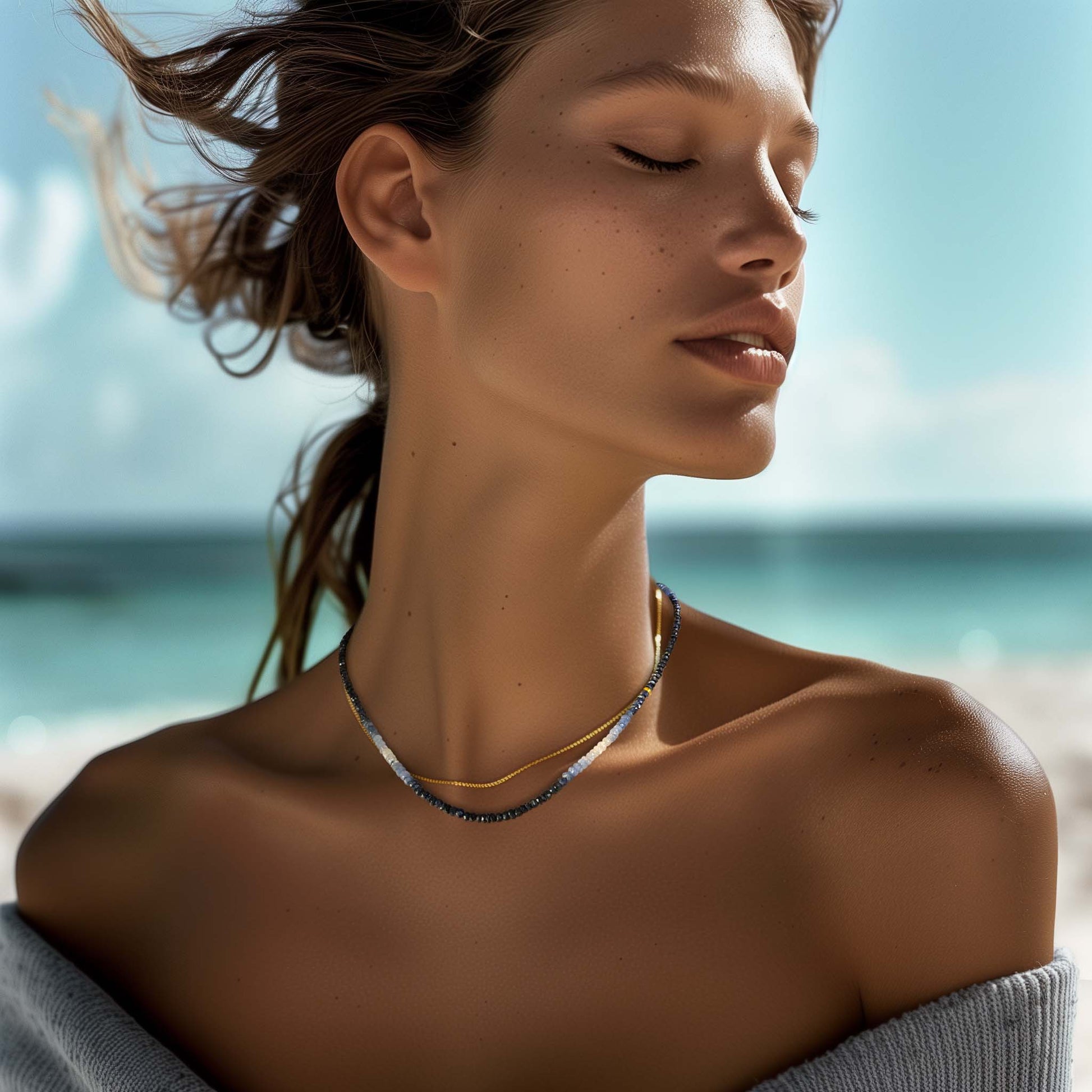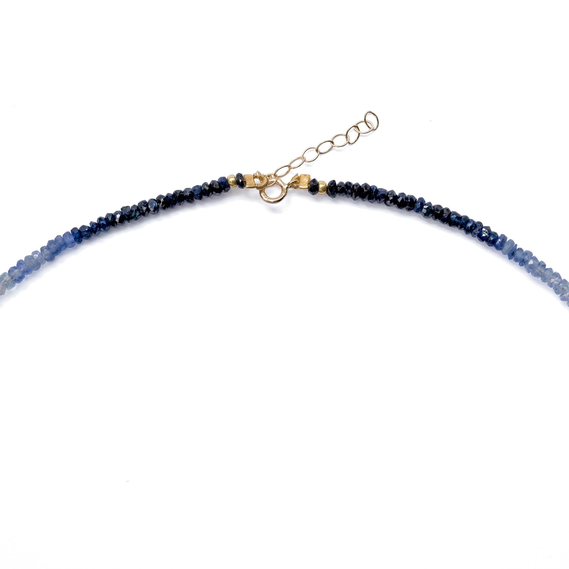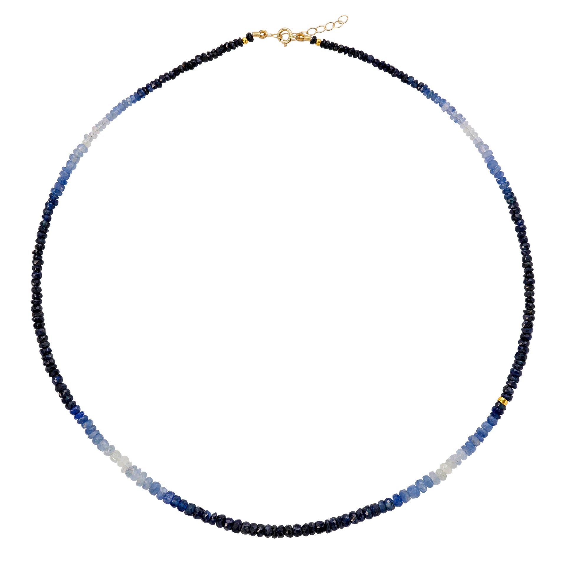 Make an unforgettable impression with the Blue Sapphire Ombré Necklace, a radiant tribute to September's celestial birthstone. Featuring faceted sapphire rondelles that transition from deep midnight blues to soft sky hues, this piece is elevated with a single 18K gold bead, adding a touch of refined luxury. A symbol of wisdom and intuition, this handcrafted necklace empowers you to face life’s challenges with confidence and grace.