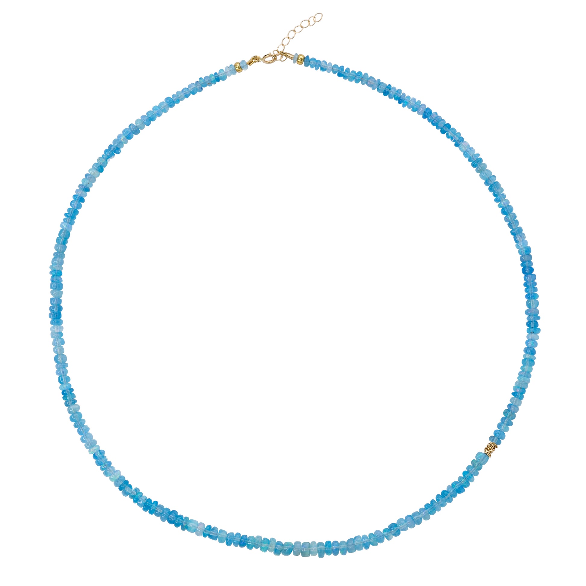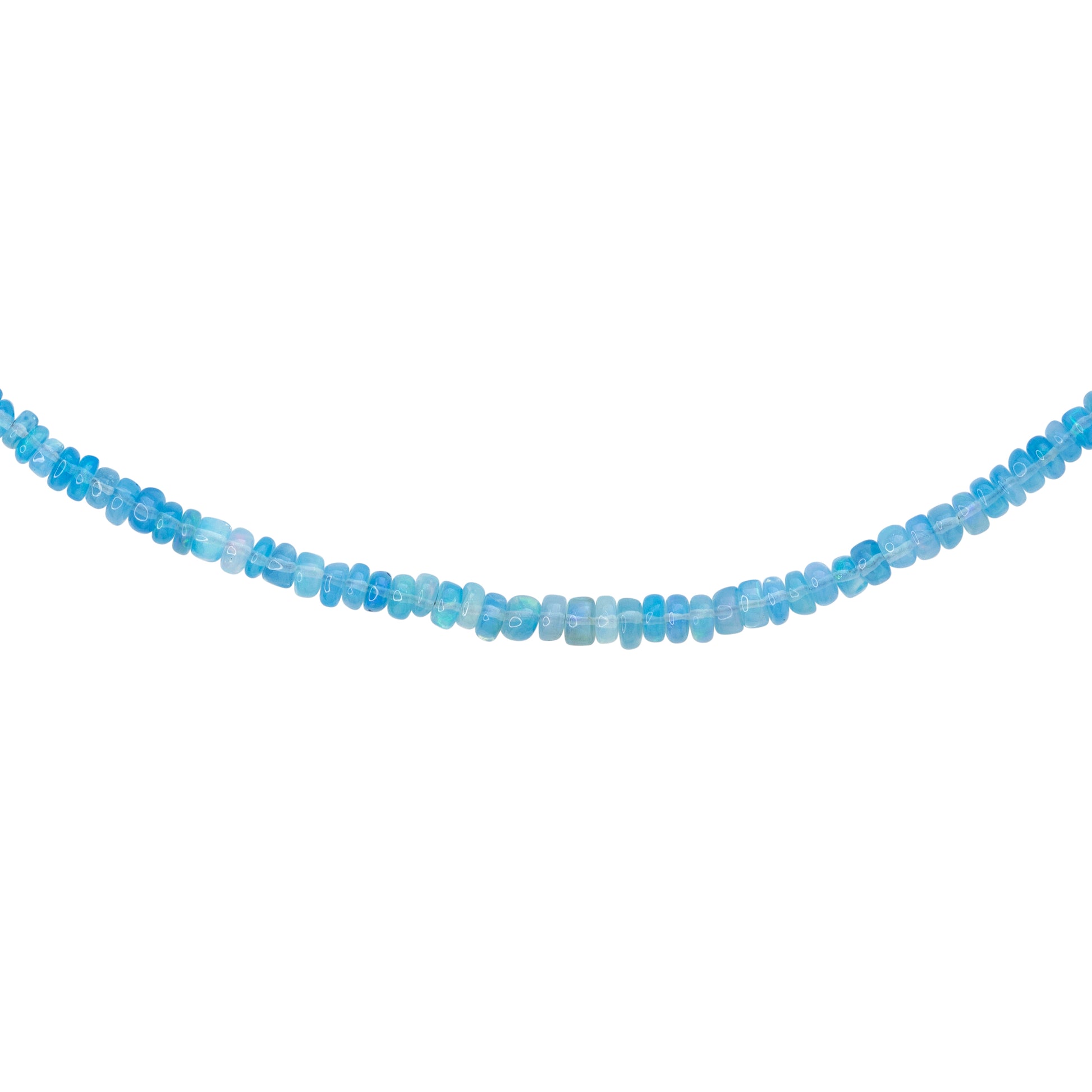 This blue opal necklace from Bombyx House features a delicate, shimmering strand of vibrant blue gemstones. The opulent opal hues evoke a sense of serene tranquility, making this piece a sophisticated accessory to complement any look.