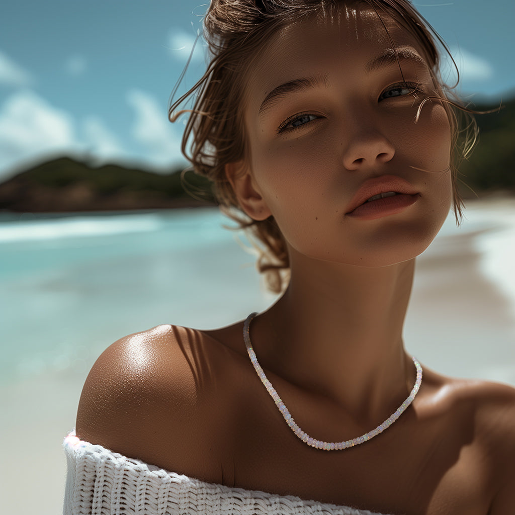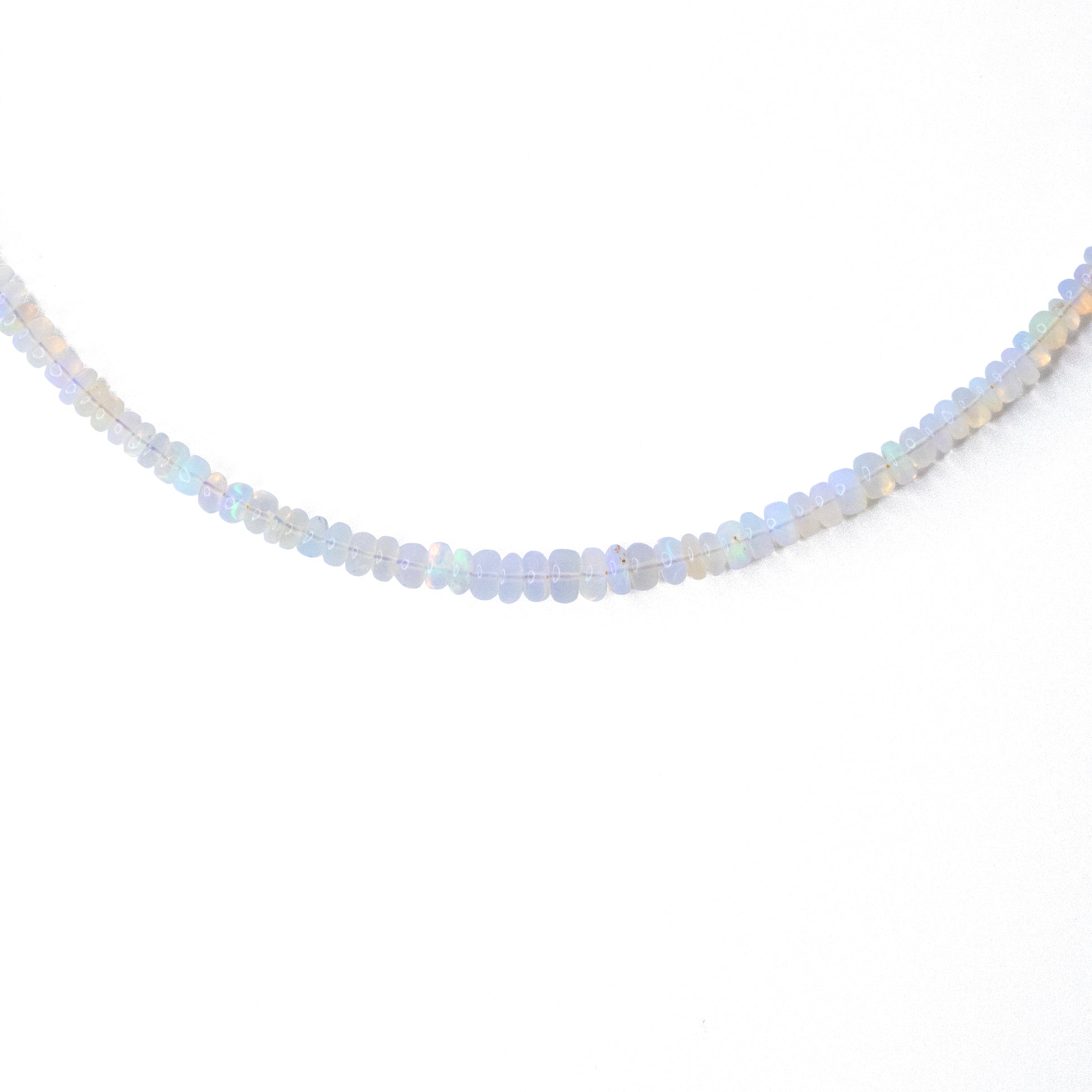 This necklace, adorned with graduated Ethiopian Opals, empowers you to step into every room with confidence and grace. It whispers of elegance and individuality, making a statement about who you are without uttering a single word.
