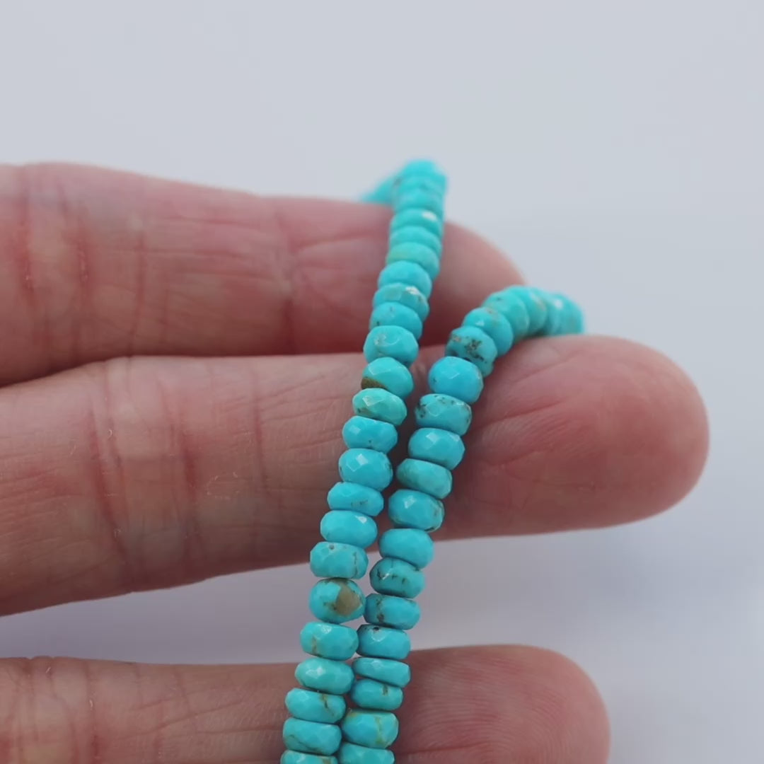 Hand-strung with natural turquoise rondelles, each bead reveals subtle variations of matrix and hue, celebrating the stone’s organic beauty. Tiny 18K gold accents punctuate the strand with quiet warmth, creating a rhythm of color and light. Finished with an 18K solid gold clasp and extension chain for adjustable wear.