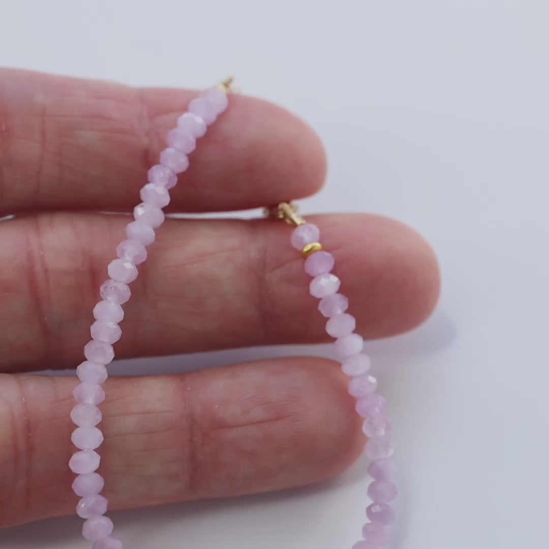 Hand-strung with natural kunzite beads, subtly faceted to enhance their gentle glow. The interplay of pastel stone and gold lends the piece a refined, modern femininity rooted in craftsmanship.