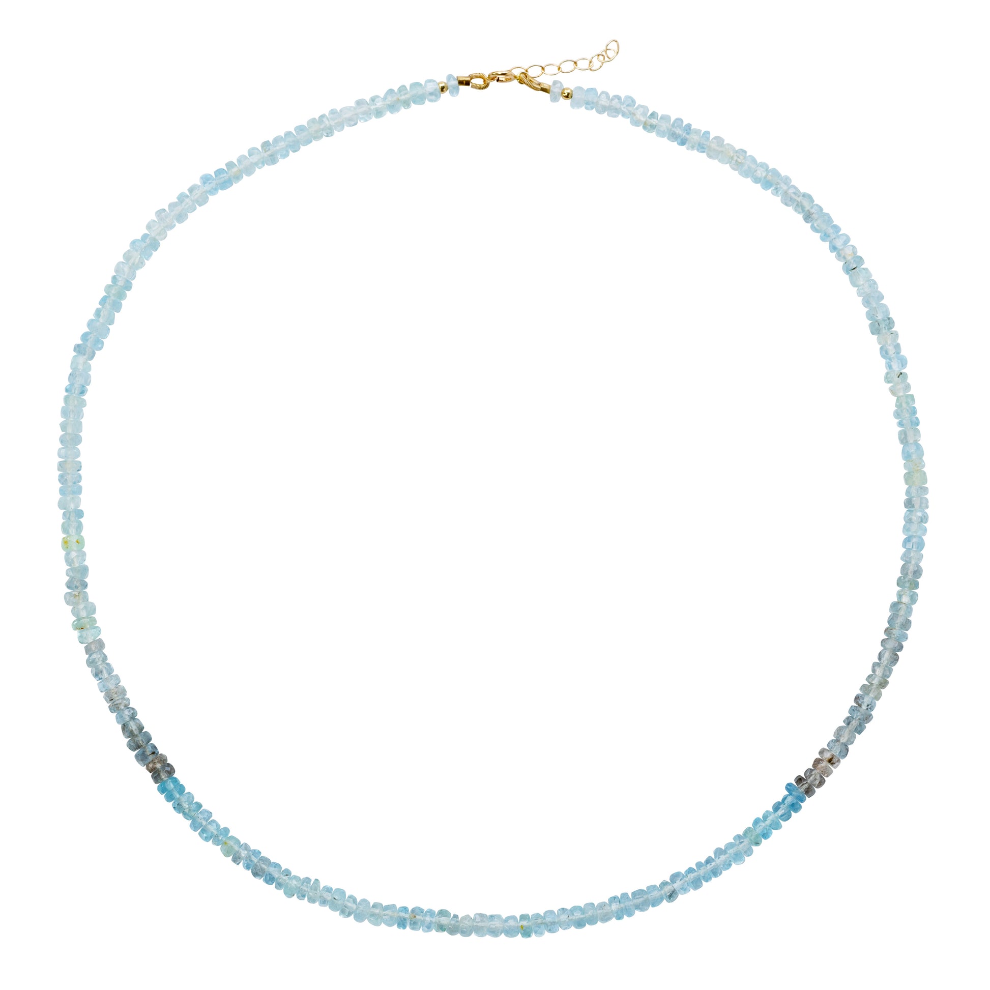 Hand-strung with graduated aquamarine beads, the necklace reveals subtle shifts in tone and natural inclusions — the “moss” that makes each stone uniquely alive. Scattered deeper hues offer quiet contrast, while polished 18K gold accents add a touch of warmth. The silhouette is slender and luminous, designed to layer seamlessly or stand alone in its simplicity.