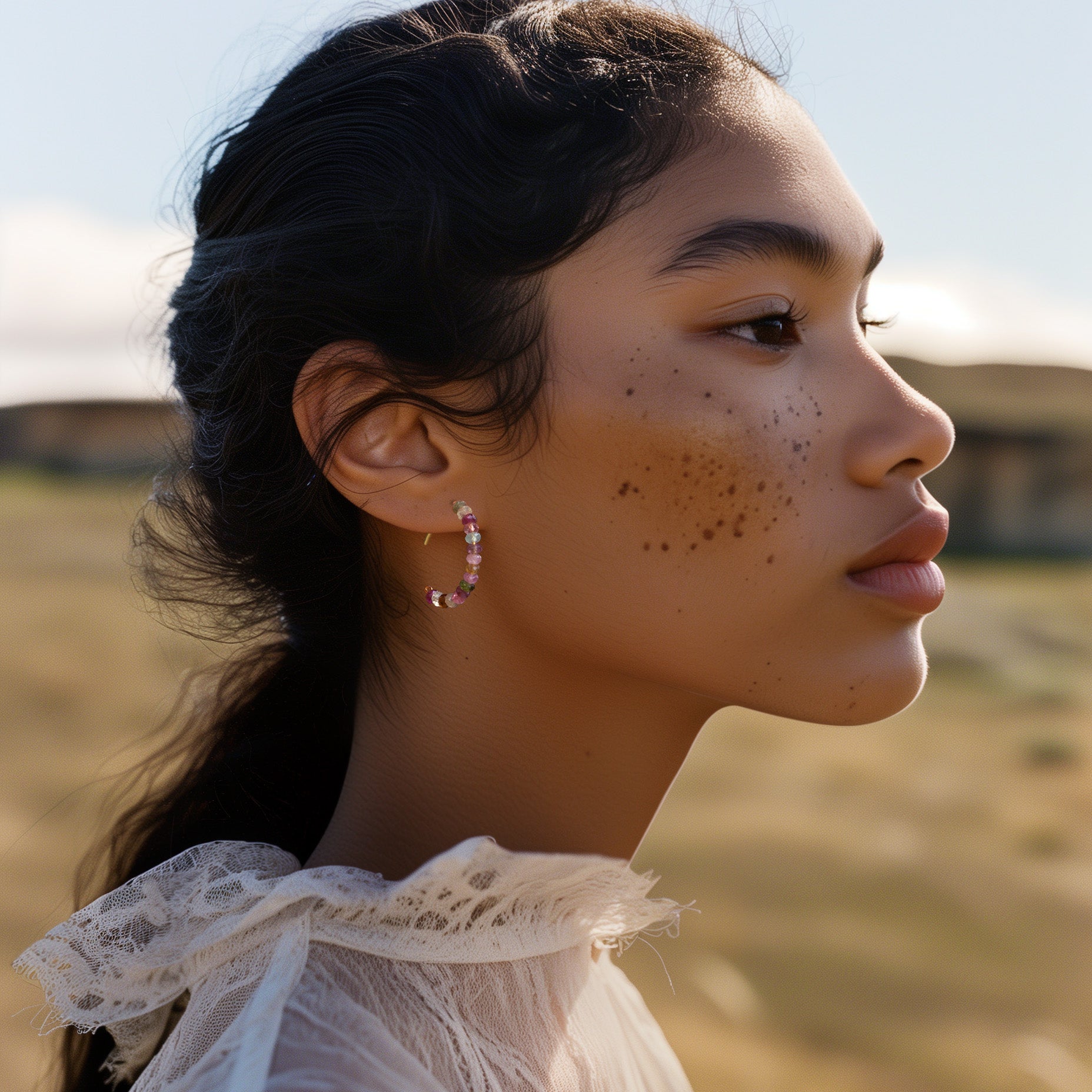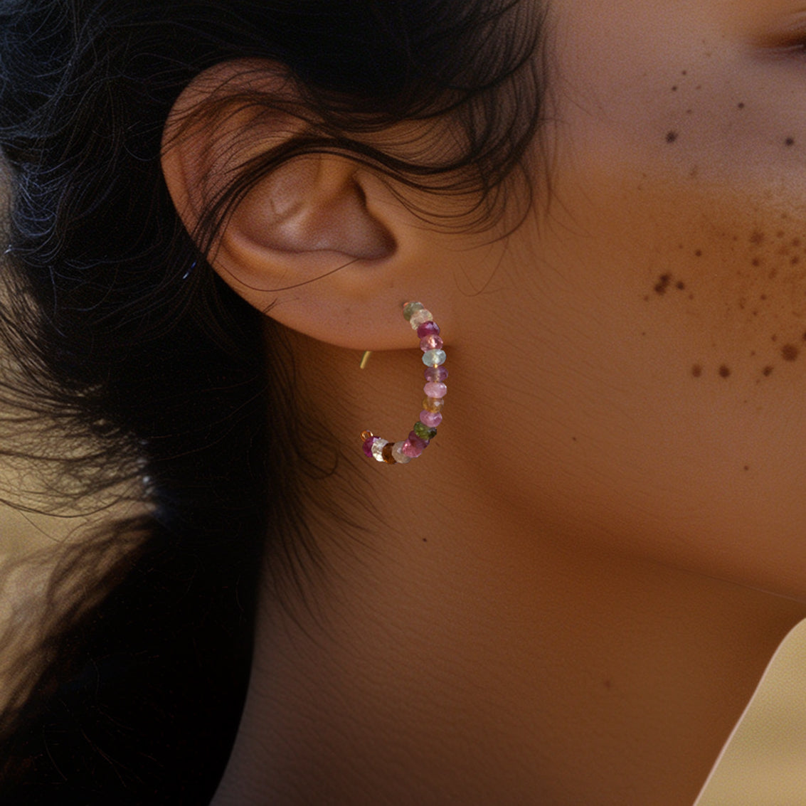 Slip these rainbow tourmaline hoops on and feel instantly radiant—like a beam of joy framing your face. Every stone holds a whisper of color and character, reminding you to express yourself boldly, beautifully, and unapologetically. They’re not just earrings—they’re a mood shift, a celebration, a signature.