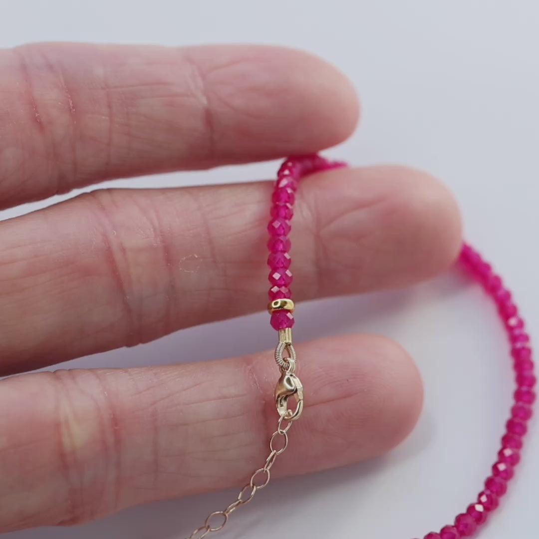 Hand-strung with natural ruby beads, delicately faceted to enhance their depth of color, the bracelet is finished with polished 14K solid gold accents and an adjustable clasp. The contrast between rich red and warm gold creates a timeless balance of elegance and intensity.